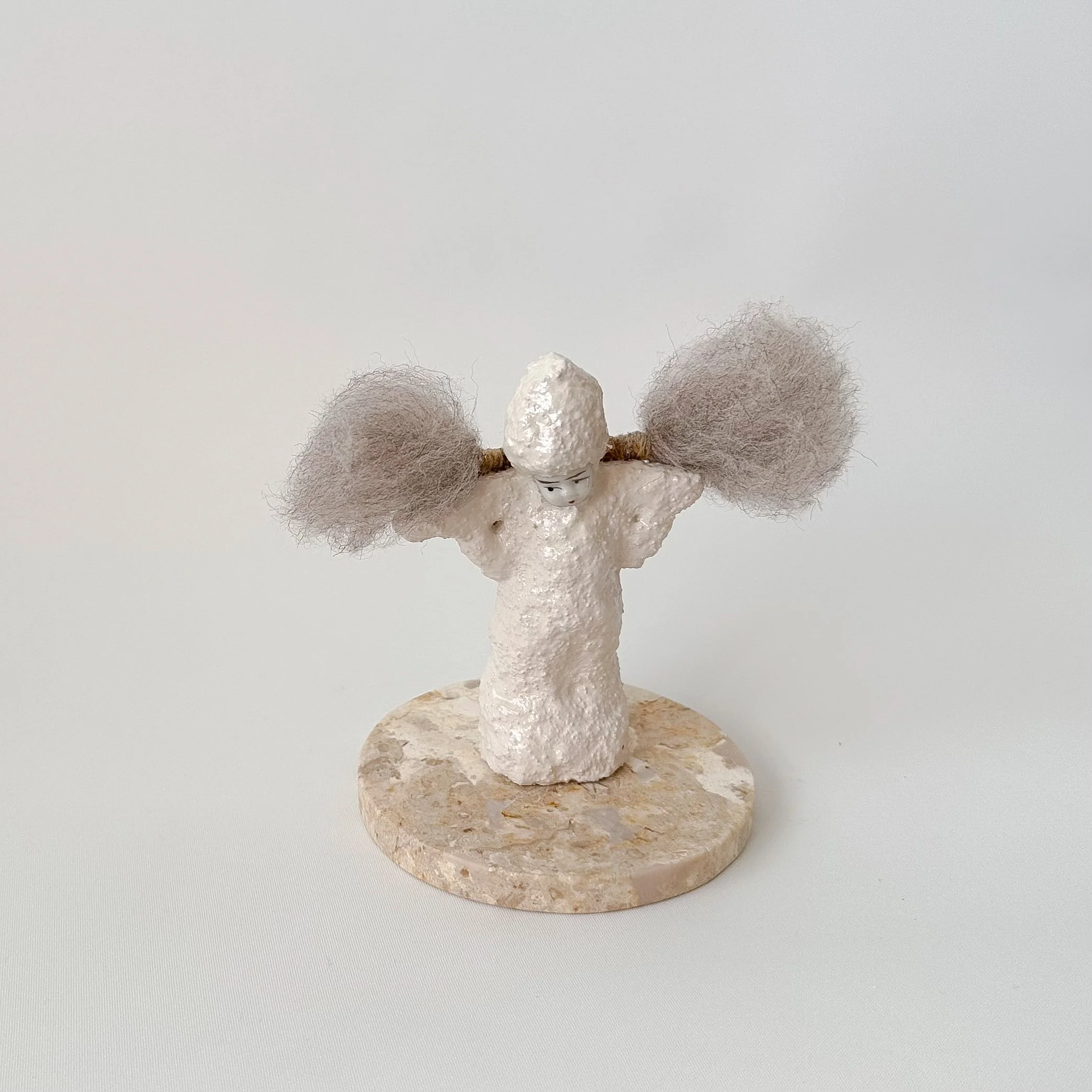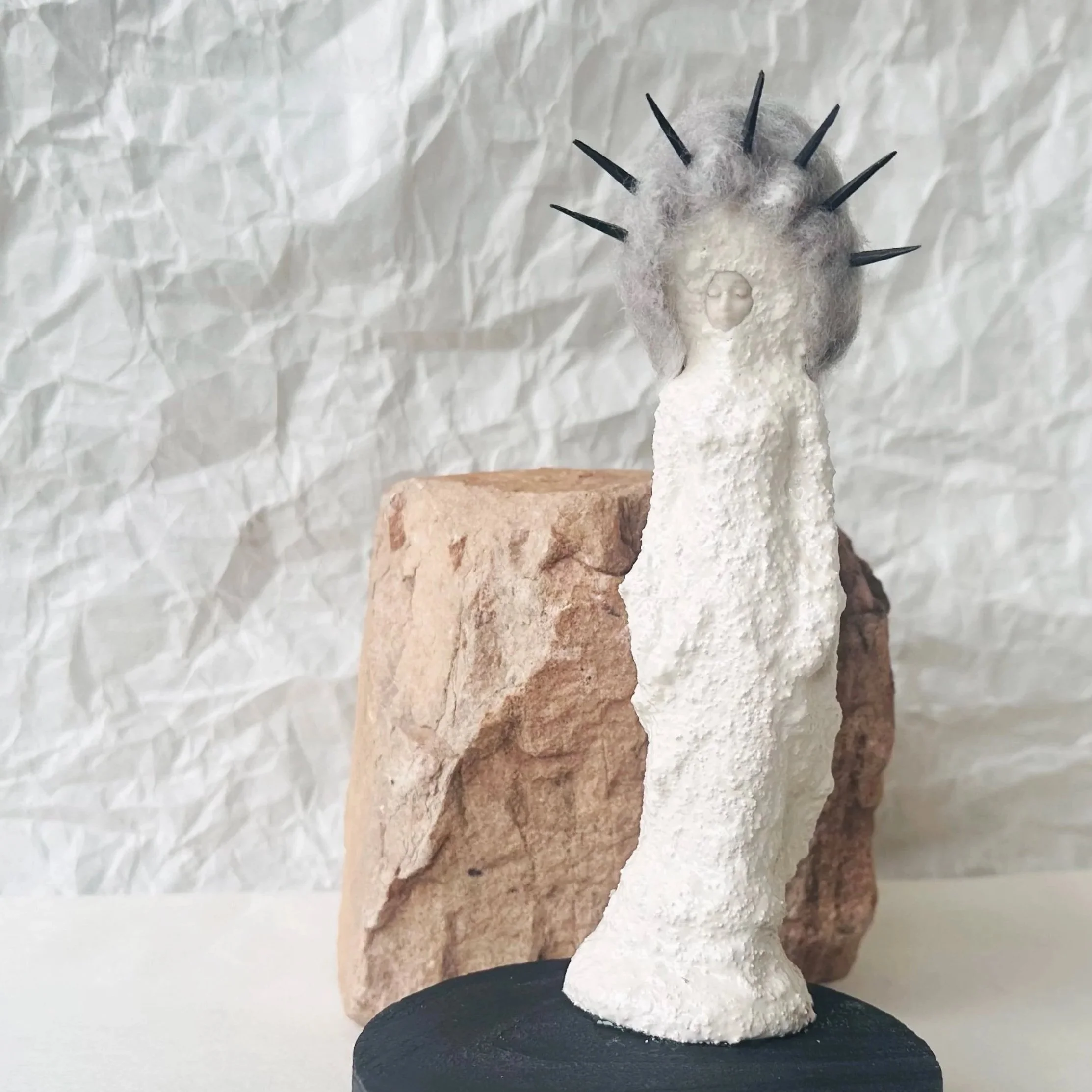 A pale figure stands with a calm, unreadable face, half-hidden above a wrap of soft grey wool. Sharp black spikes jut outward like warnings, stark against the muted textures. The body rises in a narrow, uneven column, rough and almost eroded, as if shaped by long resolve. It's severity is in the stillness, the way it stands without yielding. On a dark round base, the figure holds its ground, an angel not of comfort but of boundaries, composed and unmovable.